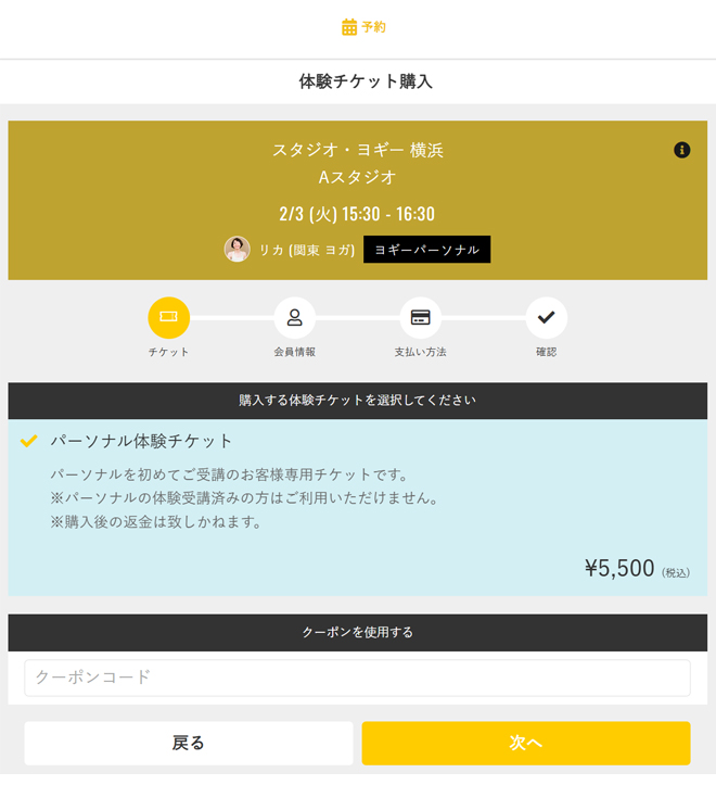 ②パーソナル体験チケット、体験後はこの画面でチケットを購入しご予約ください